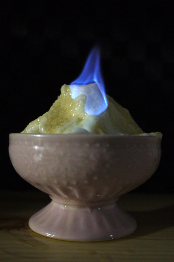 Một trong những đồ ăn tráng miệng và giải khát đang hot nhất tại Nhật Bản hiện nay là món kem “lửa trên băng”. Món ăn này rất hút khách không chỉ bởi mùi vị thơm ngon mà còn vì ngọn lửa cháy bập bùng trên kem rất đặc biệt.