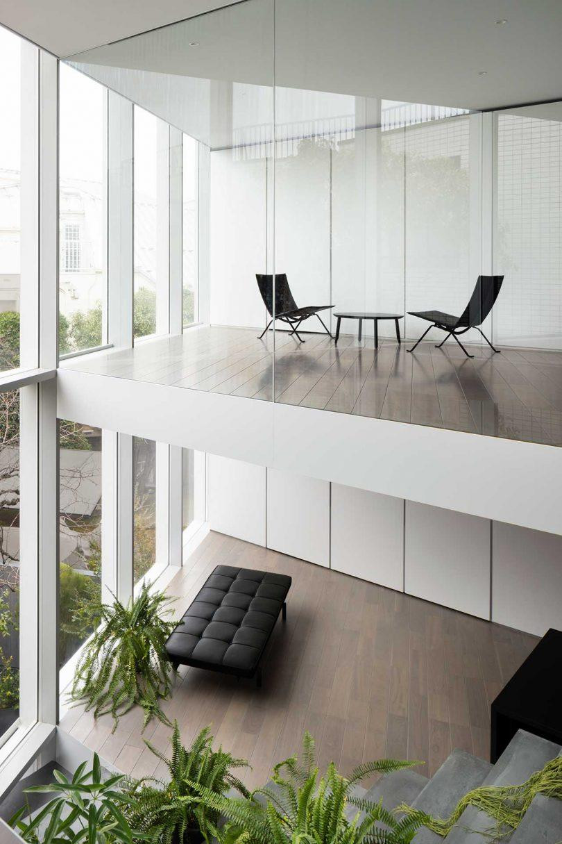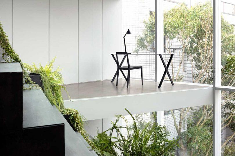| Tám con mèo thậm chí còn có một không gian dành riêng bên dưới phần ngoài trời của cầu thang.  | | Tầng hai và tầng ba là nơi ở của cặp vợ chồng trẻ cùng con của họ với không gian có chiều cao gấp đôi có thể chứa phần bên trong của cầu thang. |  |  | | Không gian phòng bếp. | |  | | Không gian nhà vệ sinh ở các tầng đều chỉ sử dụng 1 gam màu trung tính và được "giấu" phía sau cầu thang điêu khắc.  | | Một giếng trời lớn nằm trên đầu cầu thang tạo ra nơi hoàn hảo cho việc chăm sóc khu vườn bên trong nhà. |  | | Do đó người mẹ thích làm vườn đặt những chậu cây khắp cầu thang, giúp làm dịu những đường nét hiện đại và nội thất tối giản của ngôi nhà. | | |