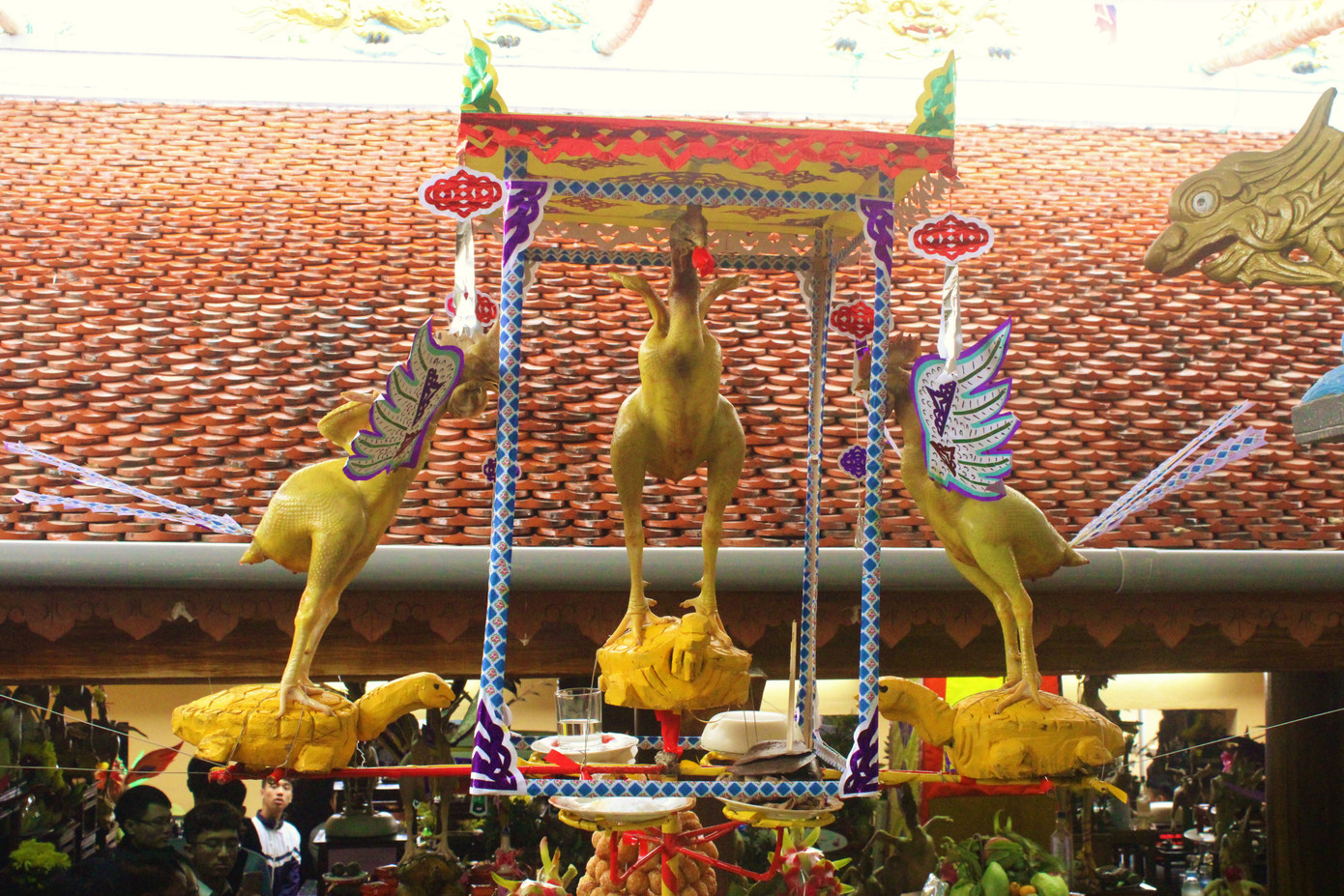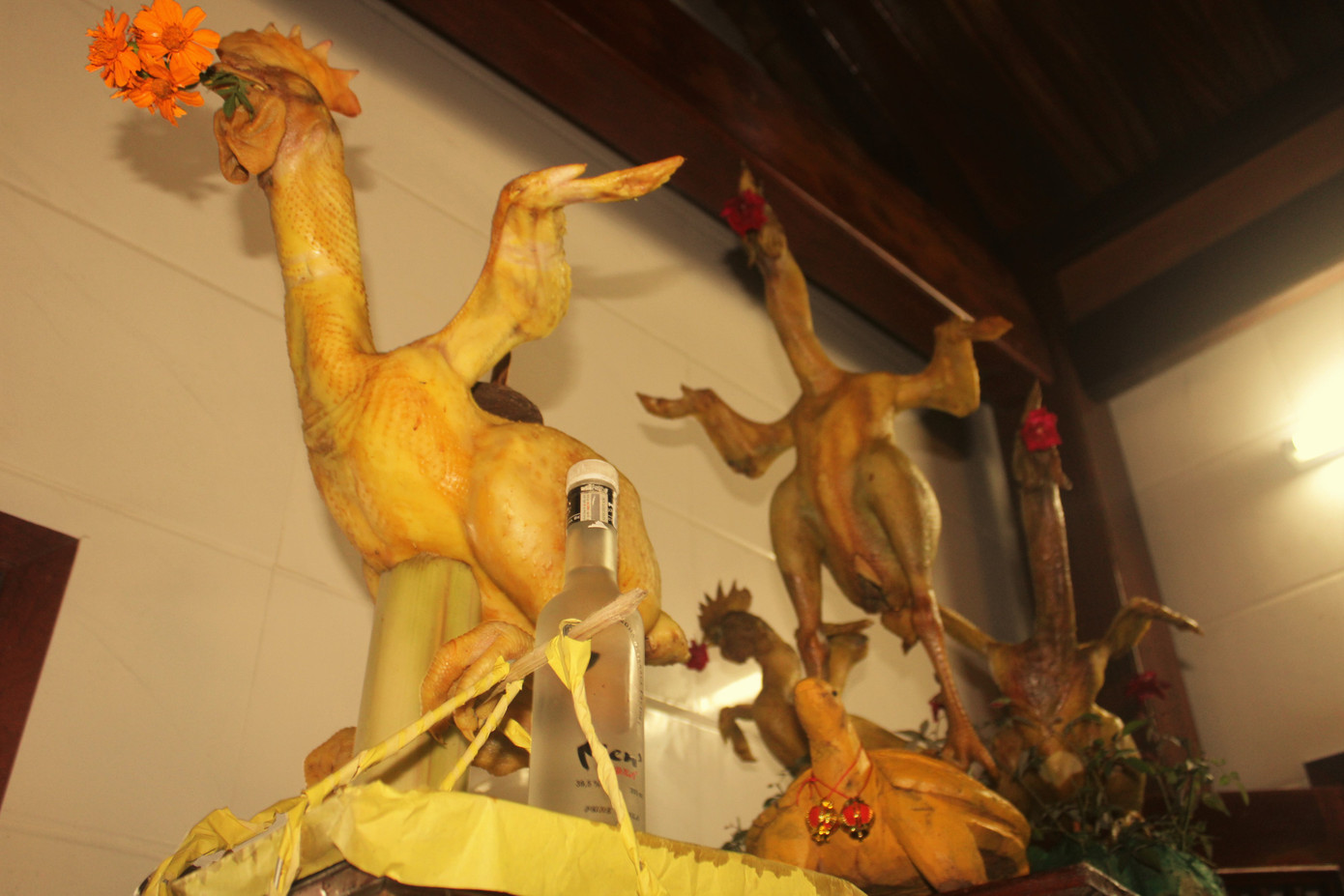 Nhiều người không khỏi ngỡ ngàng vì vẻ độc đáo của những mâm cỗ được chồng cao, những con gà cúng được tạo thế cầu kỳ, lạ mắt.