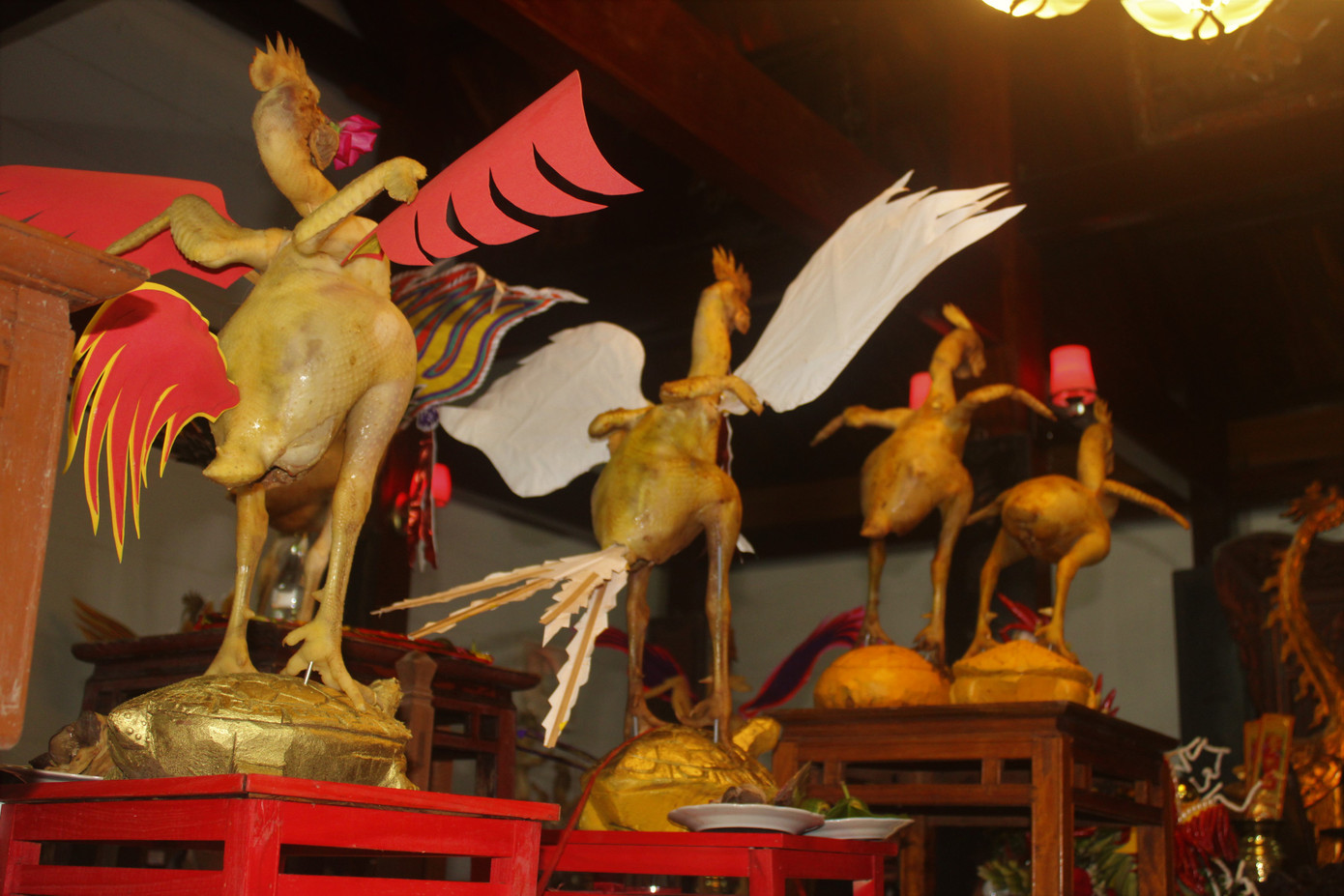 Những thế gà bay được trang trí trông rất lạ mắt.