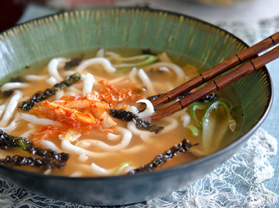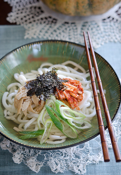 - Cho kim chi xào, đậu phụ chiên, lá rong biển và tỏi tây lên trên bề mặt mỳ, rắc chút hạt tiêu.
