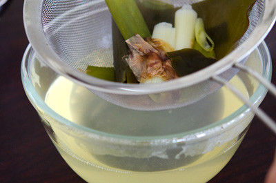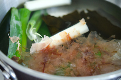 - Cho 1 lá rong biển, 1 cây tỏi tây, 50g cá ngừ bào vào nồi nước, đun sôi.
