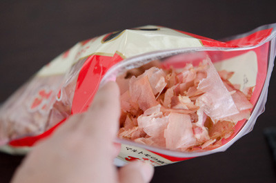 - Mở gói cá ngừ bào khô.
