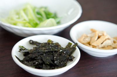 - Chuẩn bị lá rong biển thái nhỏ, tỏi tây thái nhỏ, đậu phụ chiên thái nhỏ ra các đĩa riêng.