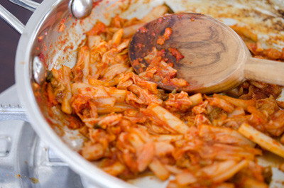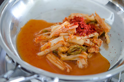 - Kim chi cải thảo xé nhỏ, trộn thêm 1 thìa nhỏ bột ớt (nếu bạn thích ăn thật cay) và 2 thìa canh nước kim chi.