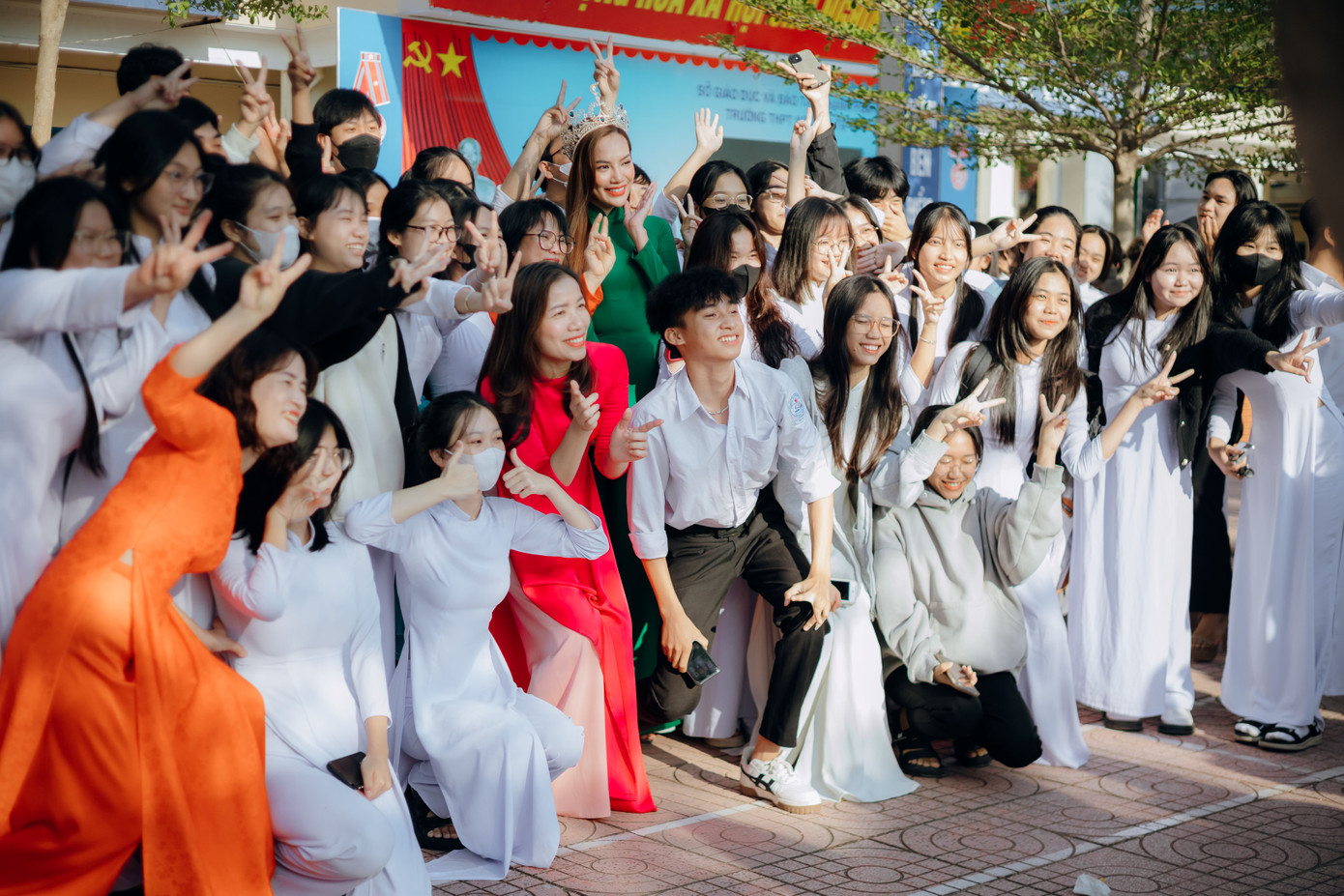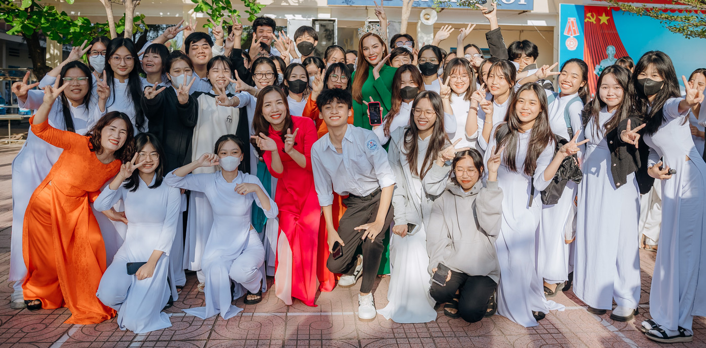 Lê Hoàng Phương đã có mặt tại trường THPT Ngô Gia Tự (Cam Ranh, tỉnh Khánh Hoà). 'Nàng Hậu' đã di chuyển bằng xe khách để kịp cho lịch trình. Đây cũng là lần đầu tiên Hoa hậu Hoà bình Việt Nam 2023trở lại thăm trường, kể từ khi đăng quang cuộc thi trong nước, lẫn đạt thành tích quốc tế.