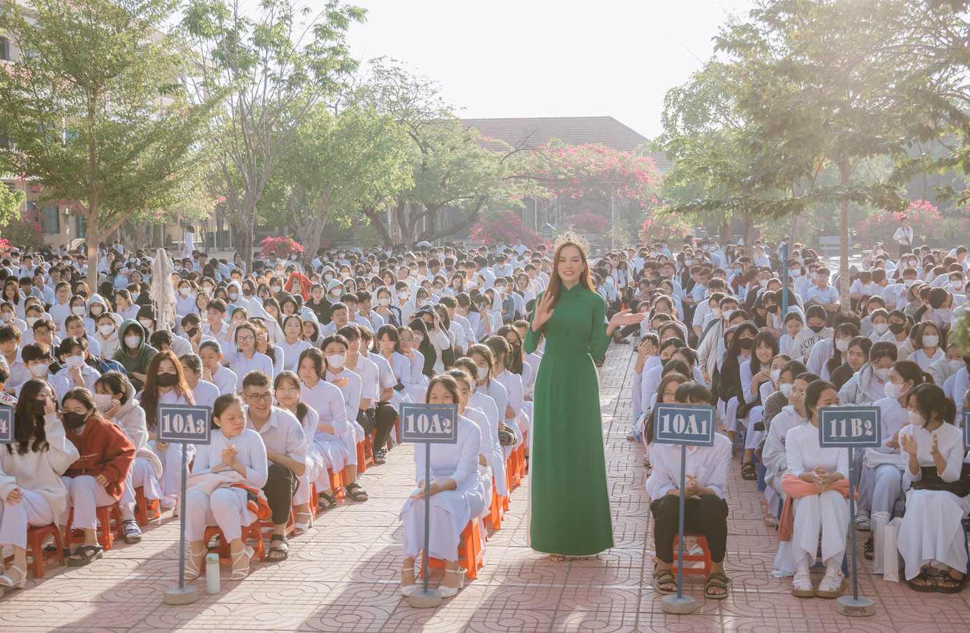 Tại đây, Lê Hoàng Phương diện tà áo dài thướt tha, dịu dàng, cùng chiếc vương miện danh hiệu Á hậu 4 từ cuộc thi Miss Grand International 2023. Cô bày tỏ nỗi bồi hồi, nhớ về thời học sinh trong buổi thăm trường và tri ân. Người đẹp cũng chia sẻ, đây là nơi nung nấu, hình thành nên những ước mơ, hoài bão giúp cô không ngừng cố gắng trên con đường sự nghiệp của mình.