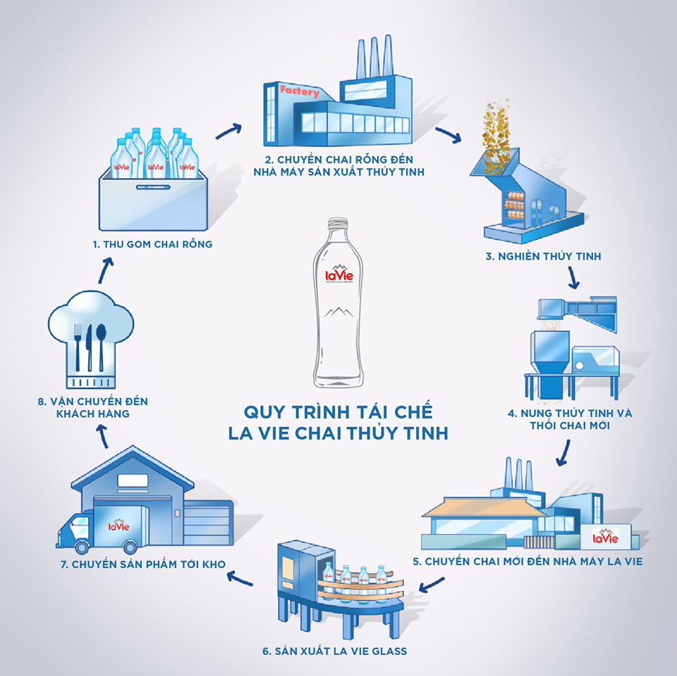 Ngoài ra, một trong những giá trị mà La Vie mang lại thông qua sản phẩm này là quy trình quản lý chặt chẽ nhằm giảm thiểu rác thải ra môi trường. Cụ thể, vỏ chai sau khi được sử dụng sẽ trải qua 8 bước, từ thu gom đến tái chế để trở thành chai thủy tinh hoàn mới và quay trở lại với người tiêu dùng. Trong đó, La Vie sẽ đầu tư thêm nguồn lực vì việc thu gom và vận chuyển vỏ chai thủy tinh tốn kém hơn và đòi hỏi nhiều nhân lực.