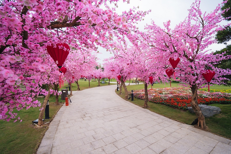 Đặt chân vào không gian lễ hội “Bonsai Trường Thọ”, ai cũng sẽ ngỡ mình như đang lạc bước trên đường phố Osaka một ngày mùa Xuân xinh đẹp. Đại lộ hoa anh đào khoe sắc rực rỡ được tạo nên từ bàn tay của những nghệ nhân hoa lụa lành nghề nhất, lấy cảm hứng từ con đường nổi tiếng Zouheikyoku của Nhật Bản, chắc chắn sẽ mang lại cho cư dân và du khách trải nghiệm du Xuân chưa từng có từ trước đến nay.
