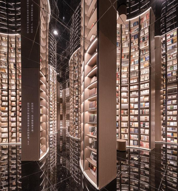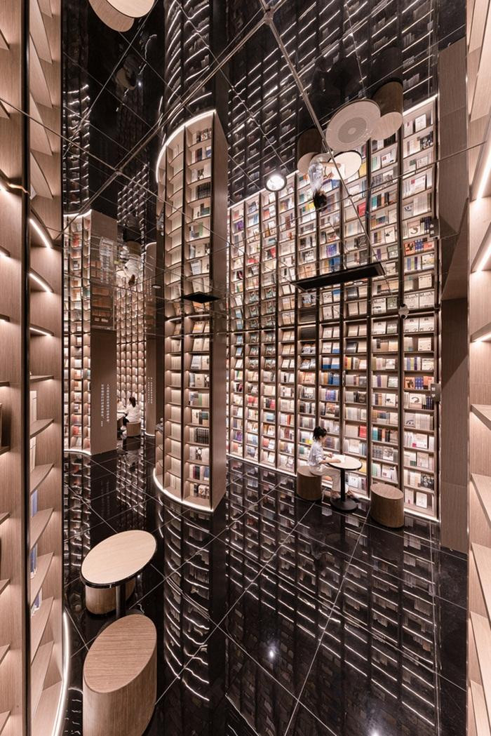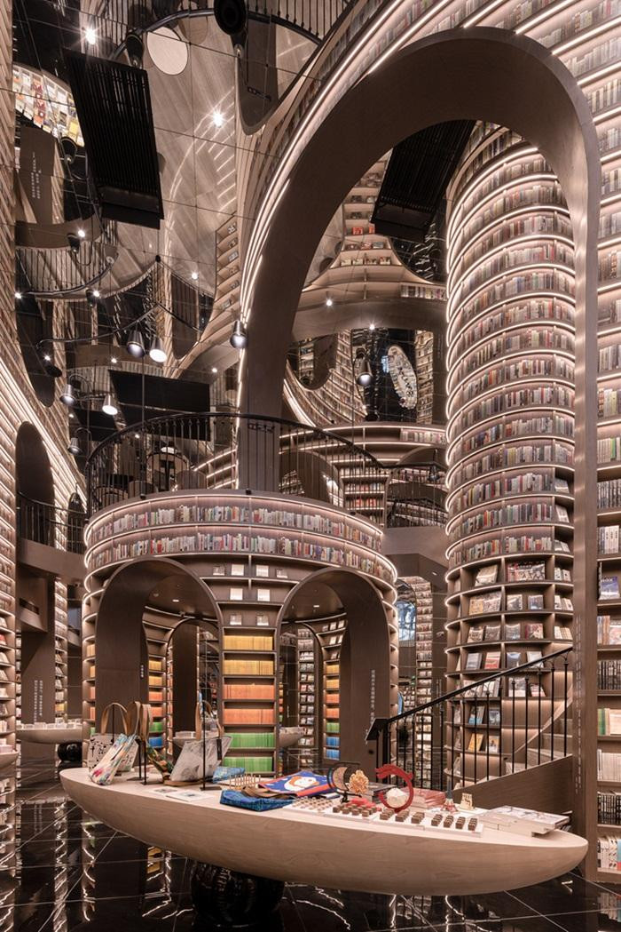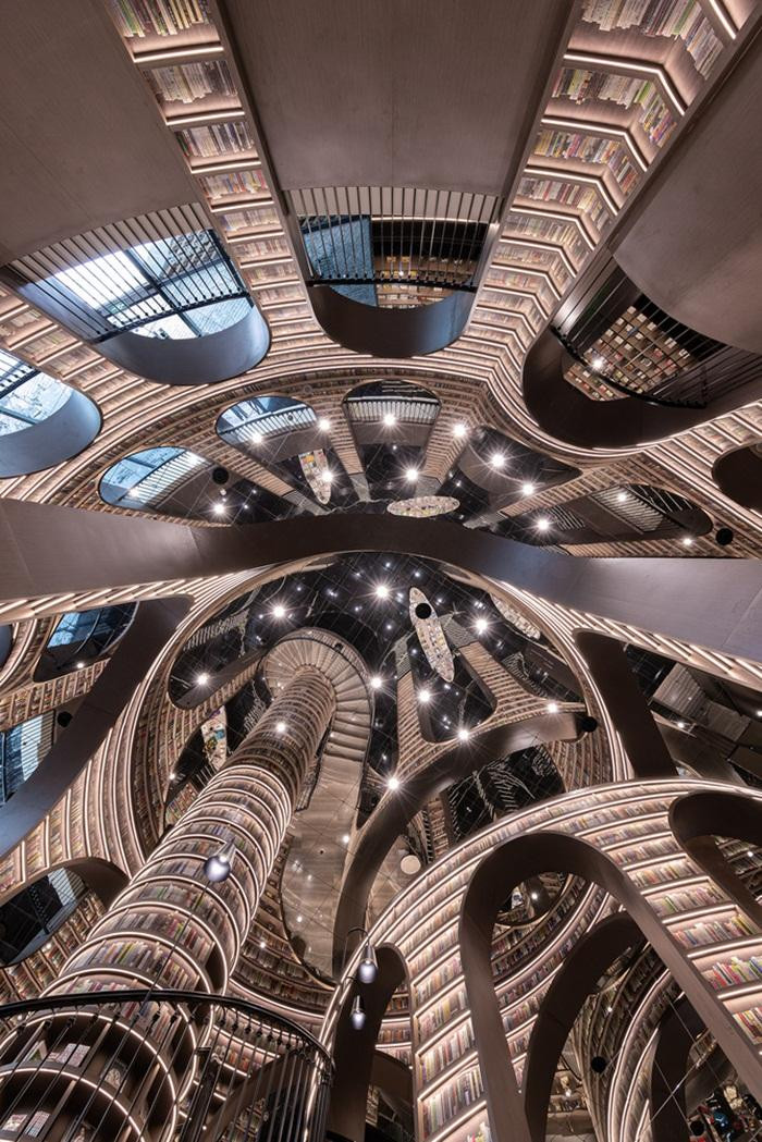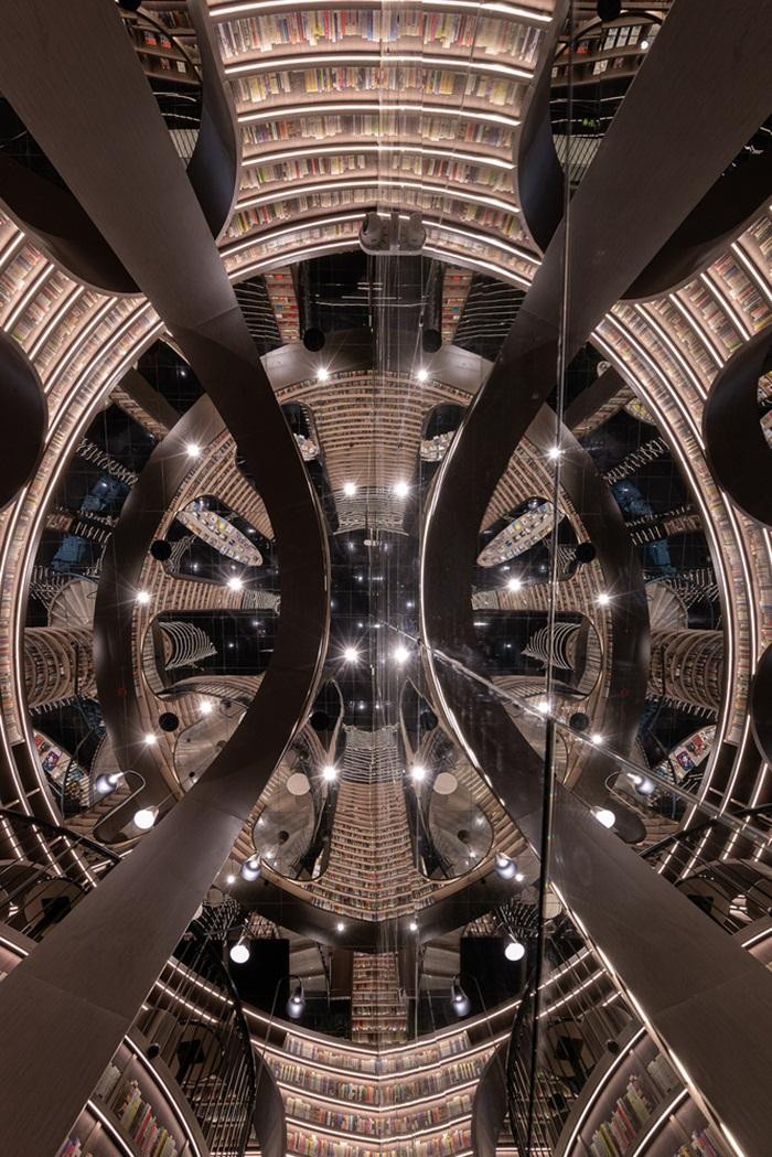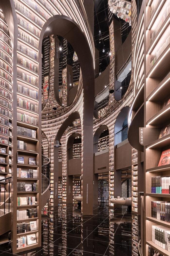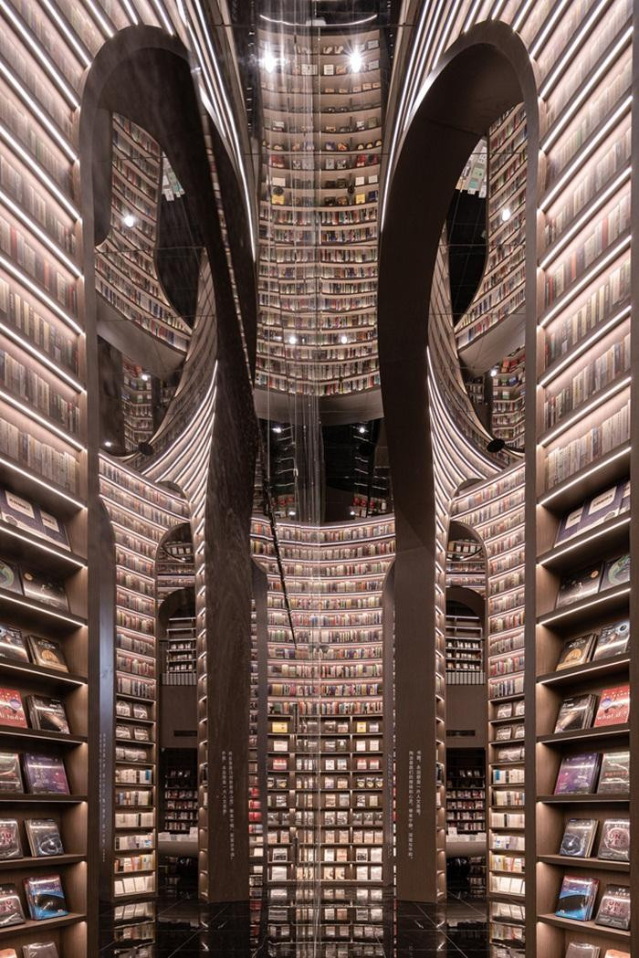 Tại Chung Thư Các ở Thành Đô, công ty thiết kế X+Living đã cho dựng những cột sách cao chạm trần, cùng hệ thống cầu thang uốn lượn quanh các cột sách giúp người đọc dễ dàng tiếp cận với các tác phẩm cần tìm.