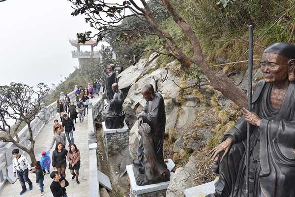 Bước chân hành hương nơi cõi Phật mây bay thiêng liêng trên khu vực đỉnh Fansipan sẽ dẫn lối du khách đến đường La Hán. Dọc con đường lát đá dài hơn 200m, 18 bức tượng La Hán đúc bằng đồng, cao 2,5m, nặng 600kg, mang 18 sắc thái cảm xúc đến nhân gian, từ bi, độ lượng, dưới những thân đỗ quyên hàng trăm năm tuổi xòa xuống lối đi. Mùa này, đỗ quyên đã bung nở những sắc đỏ, vàng, trắng, tím hồng rực rỡ. Ngày nắng, trời Fansipan sáng bừng. Ngày mây nhiều, những đám mây vờn quanh thân tượng, lối đi ấy như đường vào cõi Phật bồng lai. Đâu chỉ là vui hội, hành trình tâm linh nơi Hội xuân mở cổng trời Fansipan đã là đủ lý do thôi thúc du khách về miền Tây Bắc cầu an