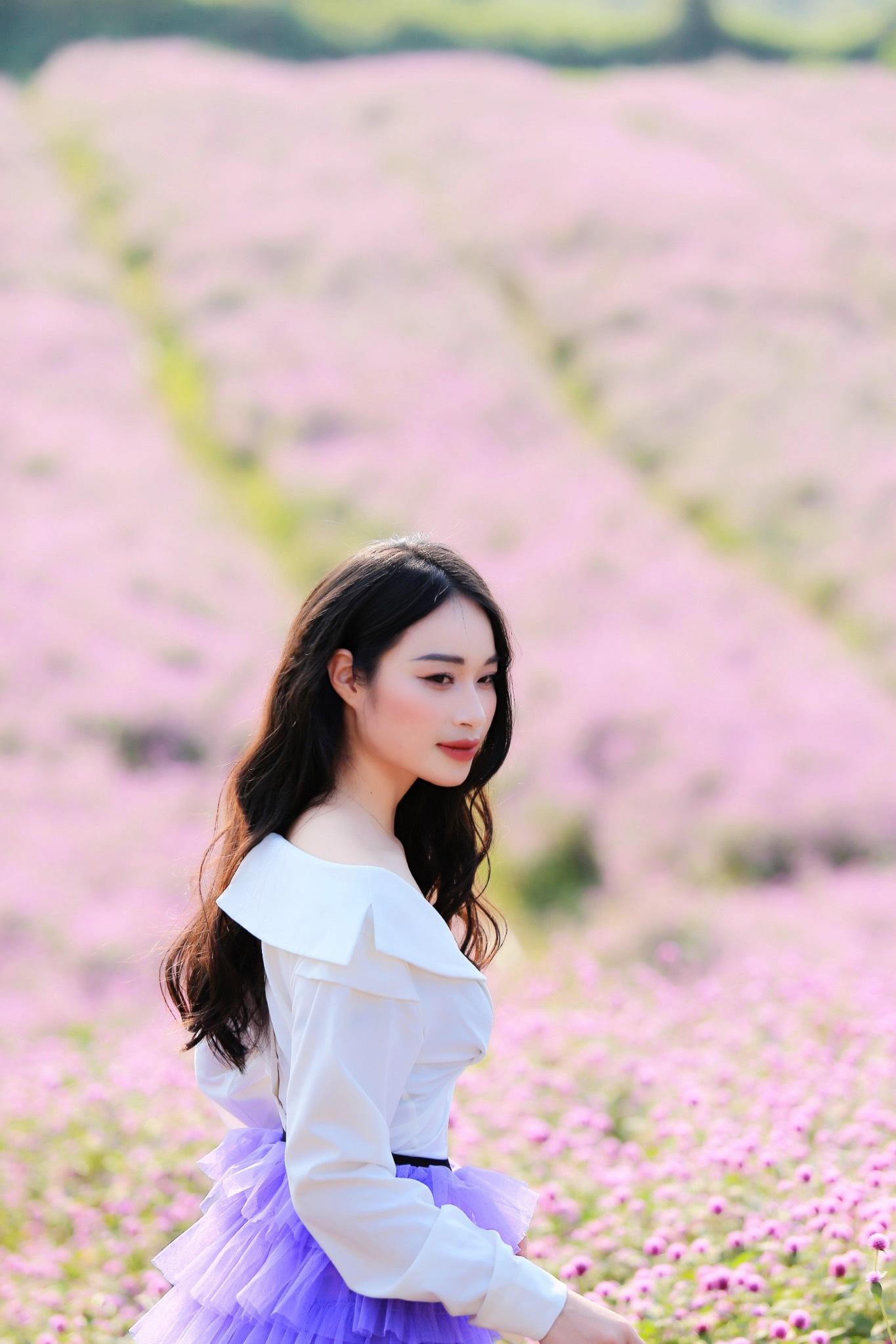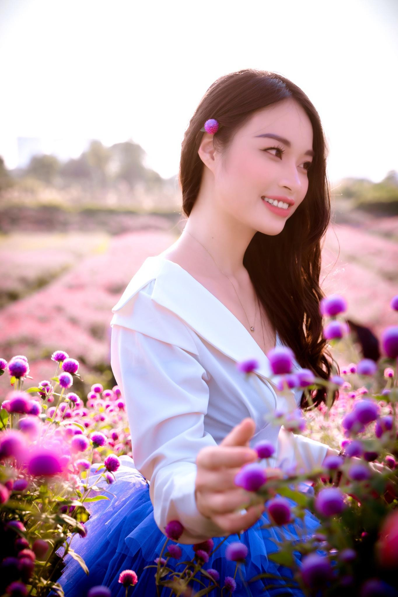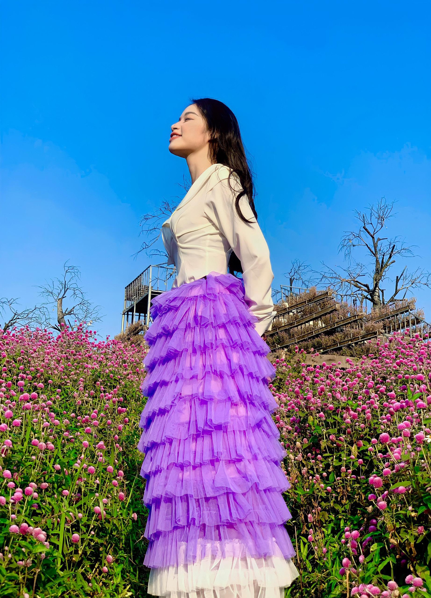 | Hải Yến chọn hoa Bách Nhật tím cho bộ ảnh |