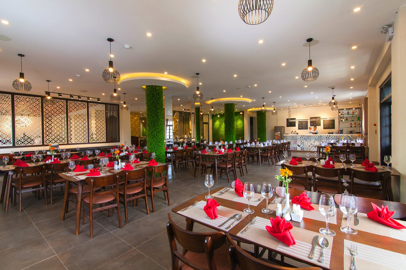 Khu vực nhà hàng của khách sạn được bài trí hài hòa để phục vụ ăn uống, với sức chứa hơn 100 khách, là nơi hội tụ phục vụ các món ăn mang đậm nét bản địa như cơm Lam, lợn bản nướng, lẩu cá Hồi, cá Tầm... các món ăn truyền thống của người Việt cũng như các món ăn phương Tây được đầu bếp chế biến công phu, tinh tế và chuẩn vị.