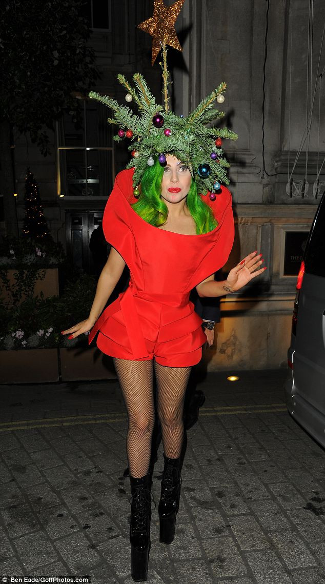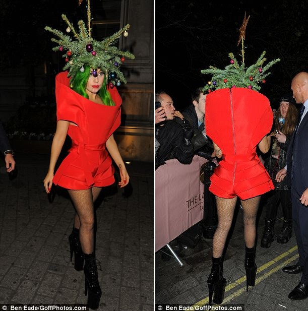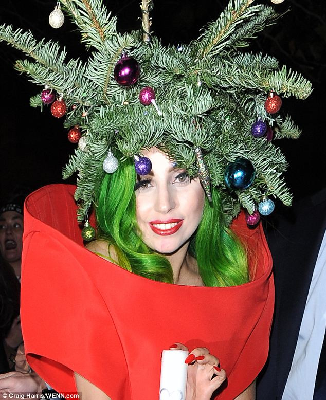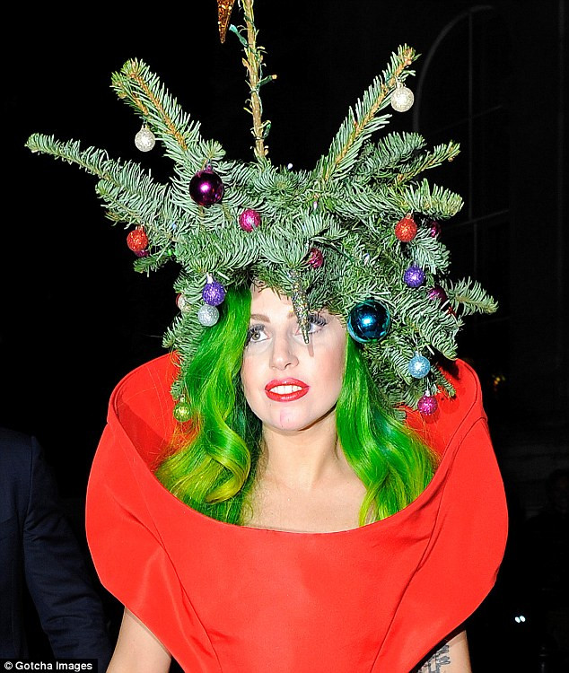 Nữ ca sĩ Applause đã đội nguyên một lùm cây thông lên trên đầu cùng với mái tóc màu xanh lá cây vô cùng nổi bật. Các fan ruột của Gaga tỏ ra rất thích thú trước việc thần tượng luôn giữ được gu thẩm mỹ không ‘đụng hàng’ với bất kỳ nghệ sĩ nào.
