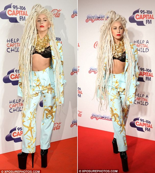 Không dừng lại ở đó, bộ trang phục thứ ba trong ngày của Lady cũng rất đặc biệt. Trong buổi concert Jingle Bell Ball, Lady Gaga tiếp tục thu hút mọi ánh nhìn bởi kiểu tóc bện thừng màu bạch kim dài ngoằng của mình. Quả thực Gaga đã rất biết cách làm cho công chúng phải nhớ đến mình mỗi khi xuất hiện.