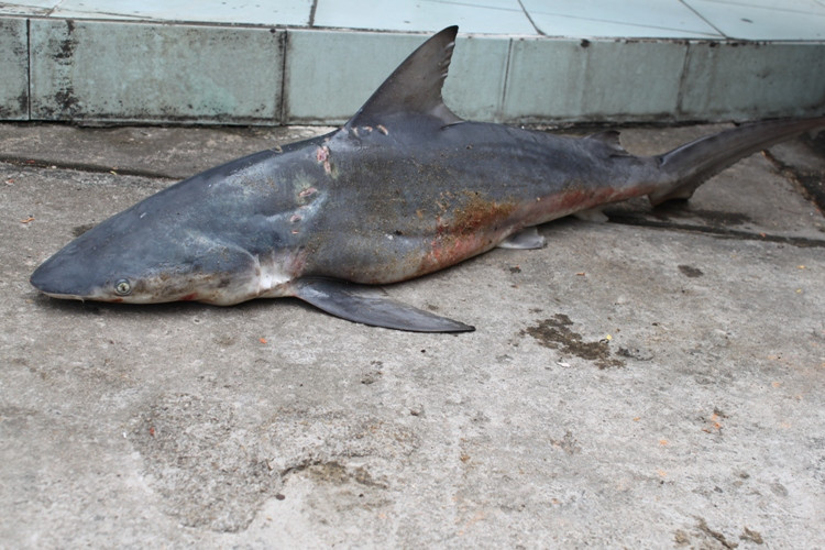 Con cá mập sọc trắng, giống đực nặng gần 7kg, dài 0,9m, chu vi bụng 45cm cắn câu vào khoảng 3 giờ sáng ngày 13-7.