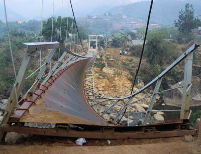 Cầu sập do đứt tăng đơ len (đoạn ốc neo) vì quá tải khiến nhiều người rơi xuống lòng suối cạn nhiều đá tảng lởm chởm...