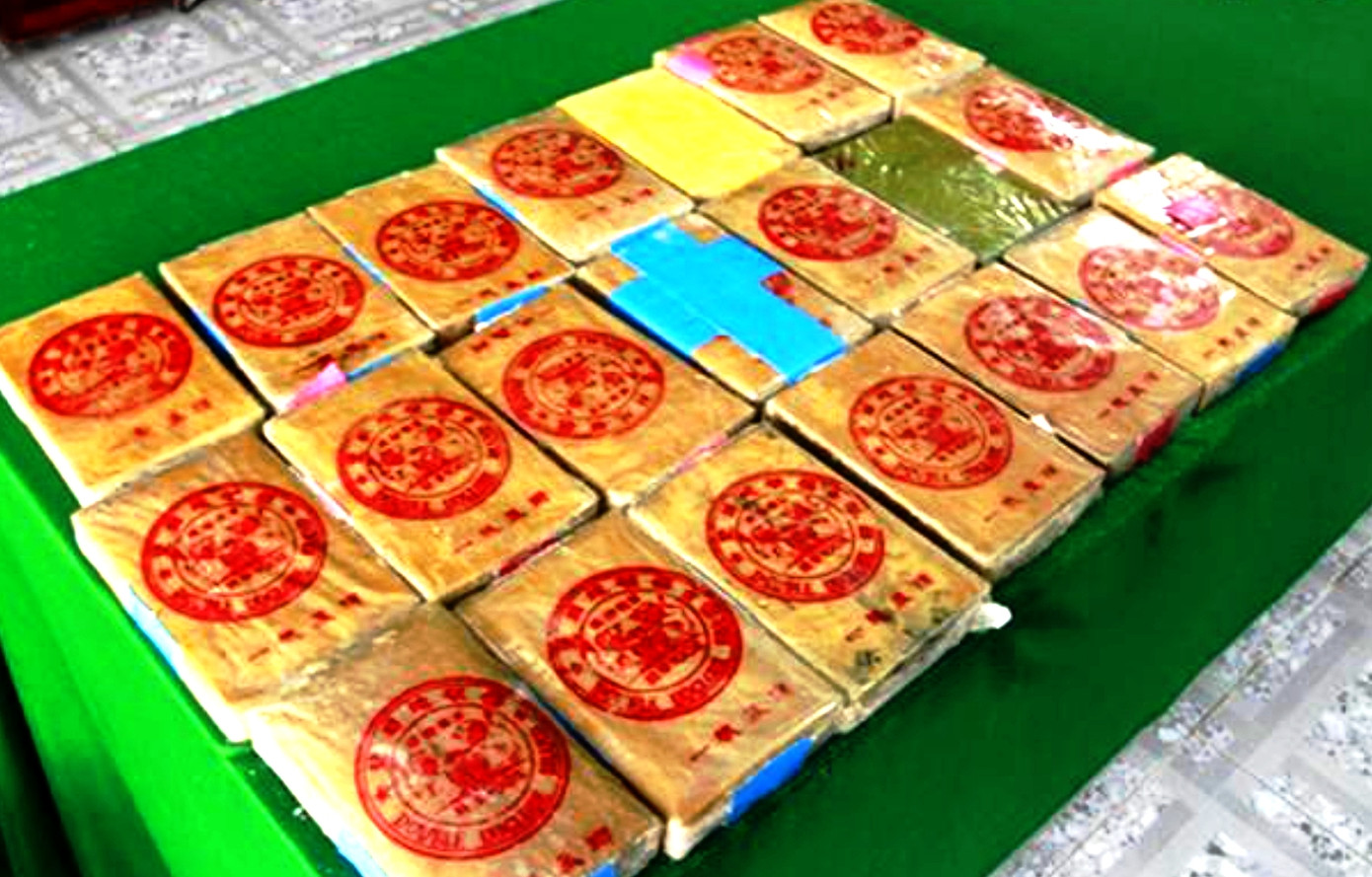 Tiến hành kiểm tra bên trong, cơ quan chức năng ghi nhận chiếc can nhựa có chứa 21 gói nylon. Các bao gói này có màu vàng, hình khối chữ nhật, mặt ngoài in 1 logo hình tròn kèm chữ Trung Quốc và ký tự Latinh. Một số gói khác được dán keo màu xanh dương hoặc màu hồng bên ngoài.