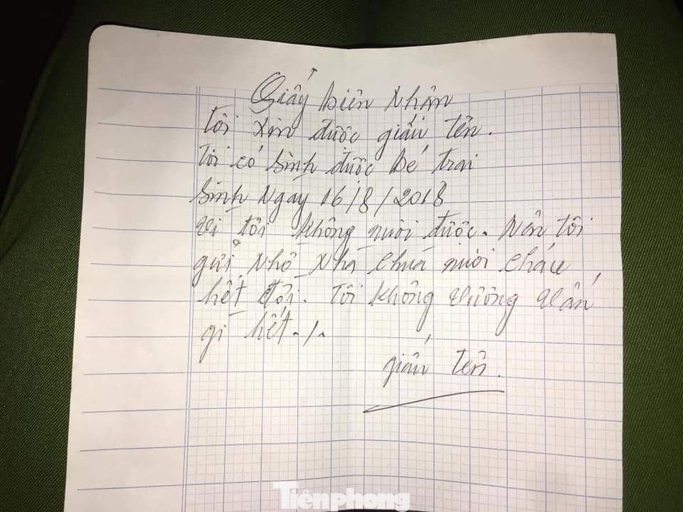 Đặc biệt, nhà chùa còn thấy một mảnh giấy do người mẹ viết để lại có nội dung: "Giấy biên nhận! Tôi xin được giấu tên, tôi có sinh được một bé trai, sinh ngày 26/8/2018. Vì tôi không nuôi được nên tôi gửi nhờ nhà chùa nuôi cháu hết đời, tôi không vương vấn gì hết".