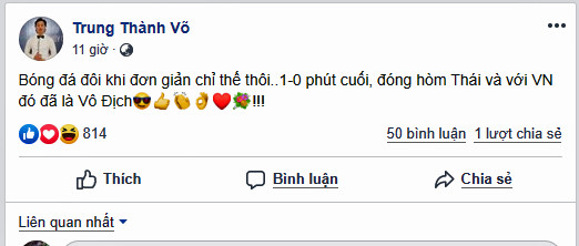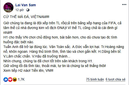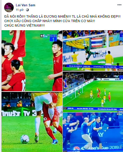 Và ngay sau khi tuyển Việt Nam giành chiến thắng, cựu MC "Ai là triệu phú" không quên viết lời chúc mừng đội tuyển Việt Nam trên trang cá nhân. "Đã nói rồi! Thắng là đương nhiên! Thái Lan là chủ nhà không đẹp. Chơi xấu cũng chấp nhá. Mình cửa trên cơ mà. Chúc mừng Việt Nam", Lại Văn Sâm viết.
