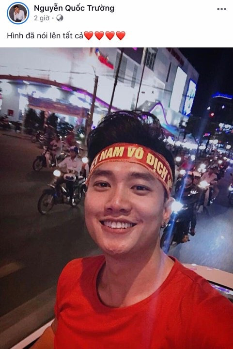 Vũ (Quốc Trường) phim "Về nhà đi con" đăng ảnh mặc áo đỏ đội băng rôn "Việt Nam vô địch" để chúc mừng chiến thắng đội tuyển nước nhà.