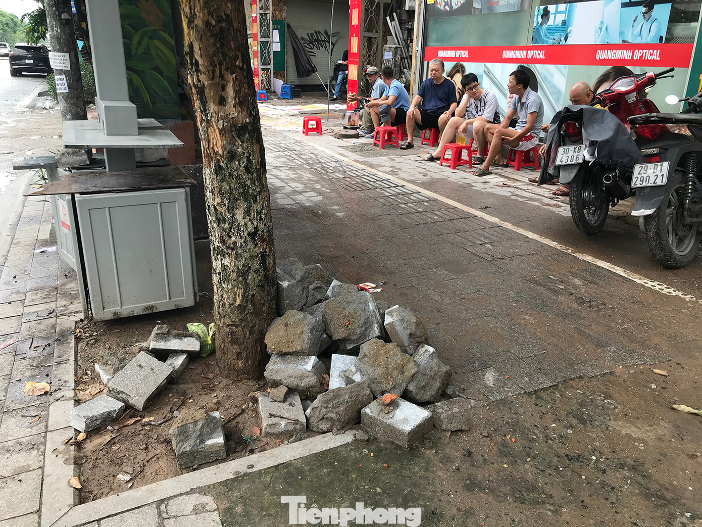 Những viên đá lát vỉa hè bị vỡ vụn sau khi đào lên, dường như không thể tái sử dụng. Ảnh: Trường Phong.