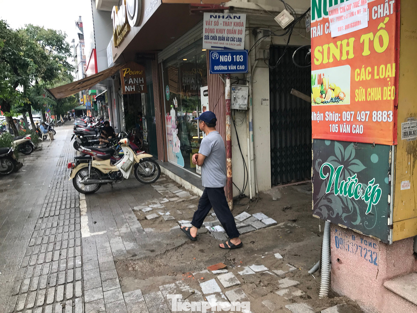 Dọc phố Văn Cao, vỉa hè lát đá tự nhiên bị cắt xẻ, hư hỏng dù chỉ mấy năm trước mới hoàn thiện cải tạo, chỉnh trang. Việc này gây băn khoăn dư luận về sự lãng phí. Ảnh: Trường Phong.