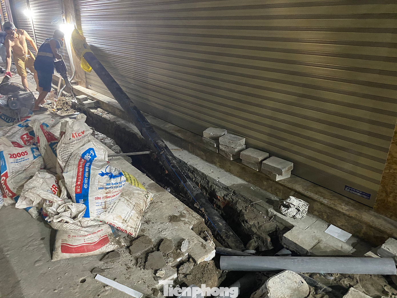 Dọc tuyến phố Văn Cao, nhiều đoạn vỉa hè bị đục phá kết cấu để thi công sửa chữa đường ống nước, dù tuyến phố này mới hoàn thiện cải tạo, lát đá tự nhiên vài năm trước. Ảnh: Trường Phong.