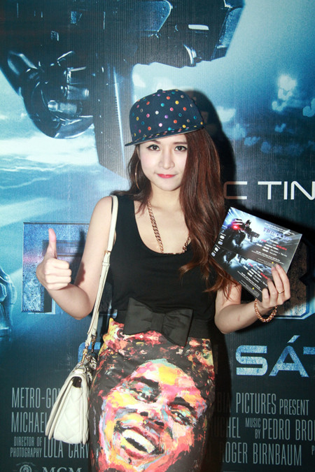 Tới dự buổi công chiếu phim 'Robotcop' tại TP HCM tối 26/2, Lâm Chi Khanh trở thành tâm điểm của mọi ống kính. Cô mặc áo corset, quần da bó sát, để hở một phần bộ ngực nóng bỏng và vòng eo thon gọn.