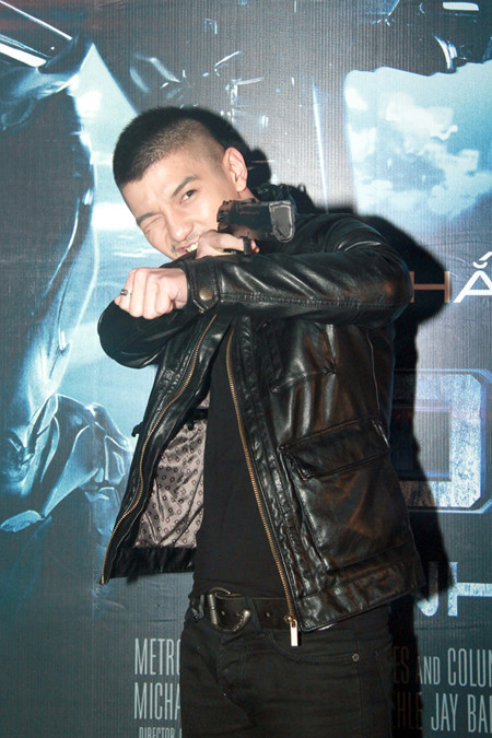 Cường Seven tạo dáng với đạo cụ là cây súng trong phim.