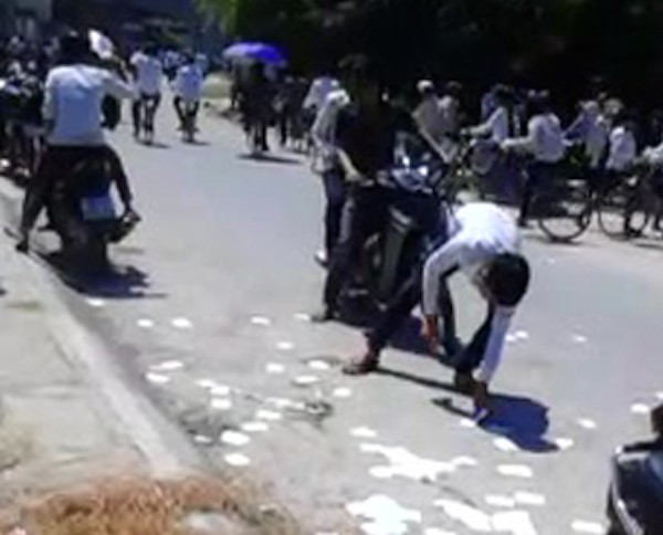 Tại thời điểm đó, lực lượng Công an xã bảo vệ khu vực cổng trường đã yêu cầu một học sinh nhặt hết số phao thi.