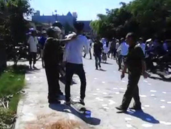 Nam thí sính nhặt phao thi sau khi bị lực lượng bảo vệ khu vực thi yêu cầu. (Ảnh cắt từ clip)