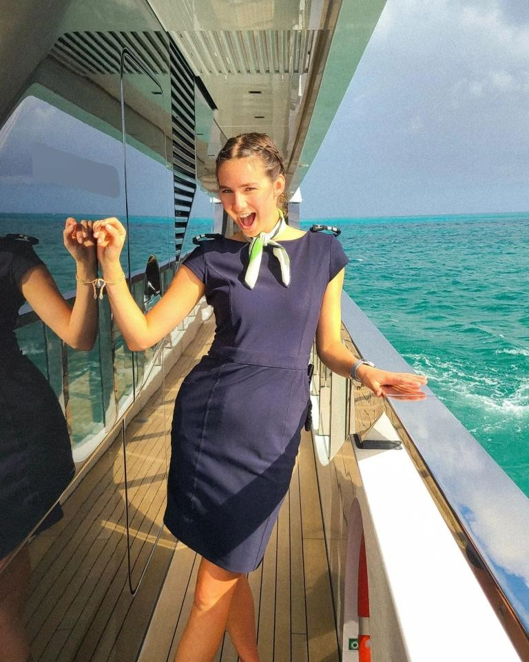 Cô cho biết: “Tôi là tiếp viên thứ 2 trên tàu, làm việc với tiếp viên trưởng và tiếp viên thứ 3. Ngoài đầu bếp, chúng tôi xếp lịch các nhân viên chăm sóc nội thất của du thuyền.”