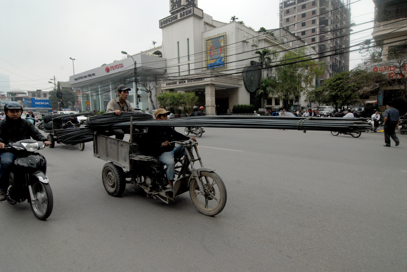 | Xe ba gác đa dụng, vừa chở thép vừa chở người. |