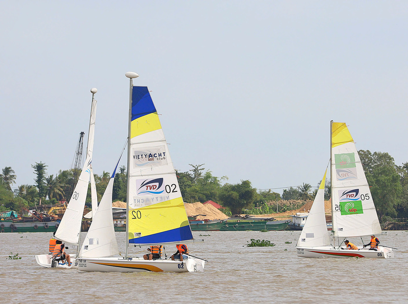 | Vận động viên tranh tài thuyền buồm trên sông Hậu. Ảnh: Minh Trung. |