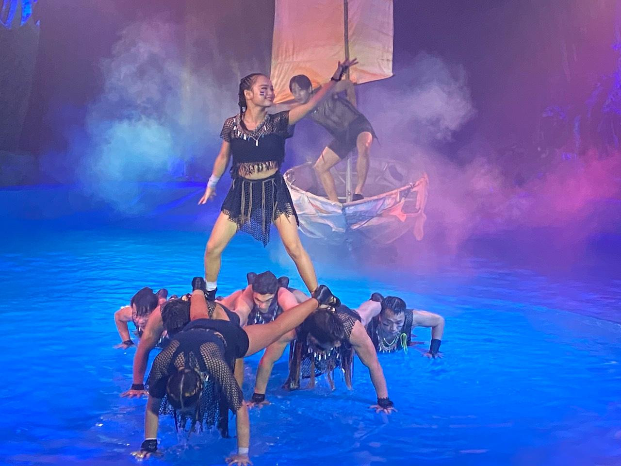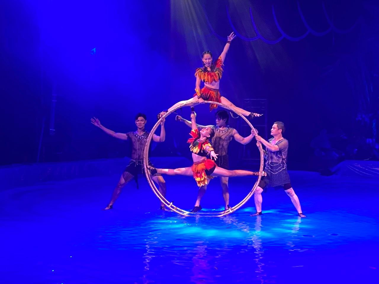 Để luyện tập cho chương trình, các diễn viên khá vất vả vì nước trơn nên những tiết mục như xe đạp một bánh, chồng người, nhảy dây… gặp nhiều khó khăn. Bù lại, nước tạo cảm giác mới lạ và hình ảnh đẹp mắt với những động tác khoác tay, chân mạnh mẽ tạo thành những màn nước trắng xóa. Trang phục cũng được đầu tư tạo nên màu sắc hoang dã sống động.