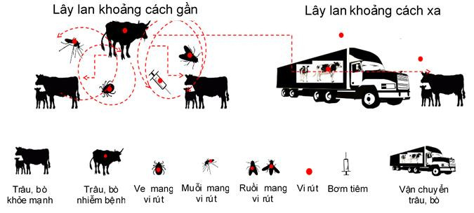 Bệnh lây truyền chủ yếu qua côn trùng đốt như muỗi, ruồi, ve; tiếp xúc giữa gia súc bệnh và gia súc khỏe mạnh; bệnh cũng có thể lây truyền do vận chuyển trâu, bò mang mầm bệnh, sử dụng chung máng uống, khu vực cho ăn, sữa, tinh dịch; thời gian ủ bệnh trung bình khoảng 4 - 14 ngày.