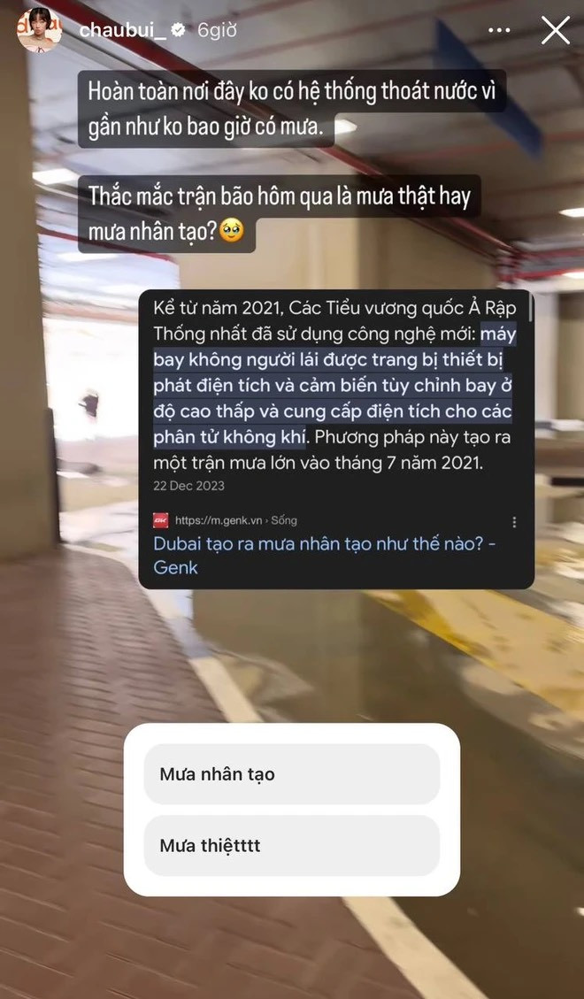 Cô cũng ghi lại những hình ảnh ngập lụt trên đường đi của mình. Ngoài ra, Châu Bùi cũng bày tỏ thêm: "75 năm mới có trận mưa to như này ở Dubai. Thật là đáng nhớ cho gia đình tôi".