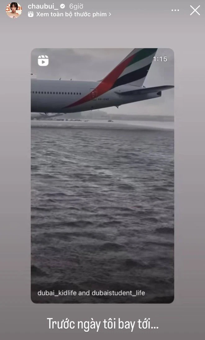 Trên trang cá nhân, nữ fashionista rất háo hức với chuyến đi này. Khi vừa bay tới Dubai, cô nàng đã ghi lại một khoảnh khắc thành phố nhìn từ trên cao. Sau đó, Châu Bùi biết tin về cơn mưa kinh hoàng vừa đổ xuống Dubai (mưa nhiều đến mức lượng mưa trong một ngày bằng tổng lượng mưa ở đây trong 2 năm).