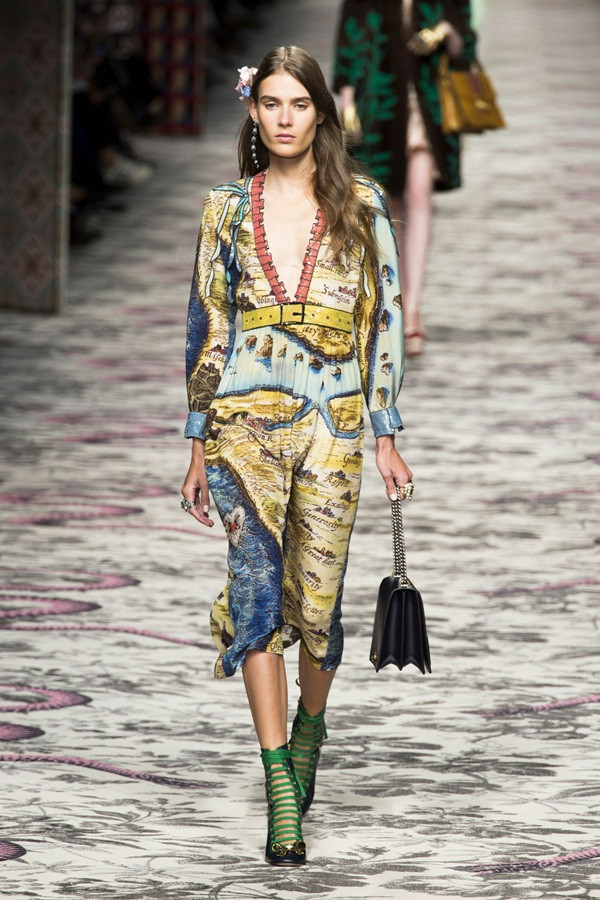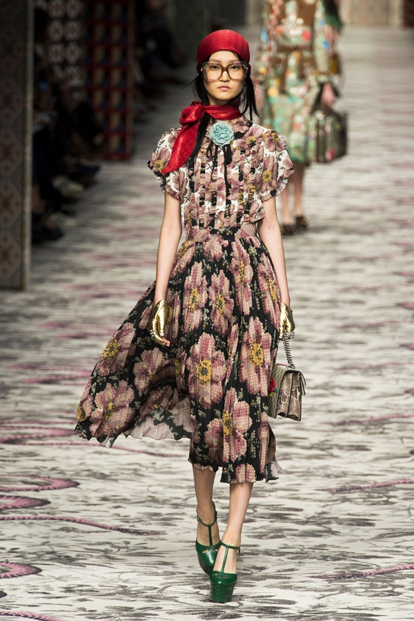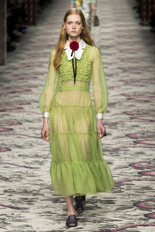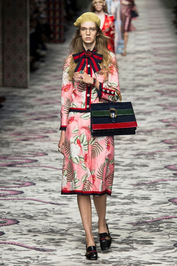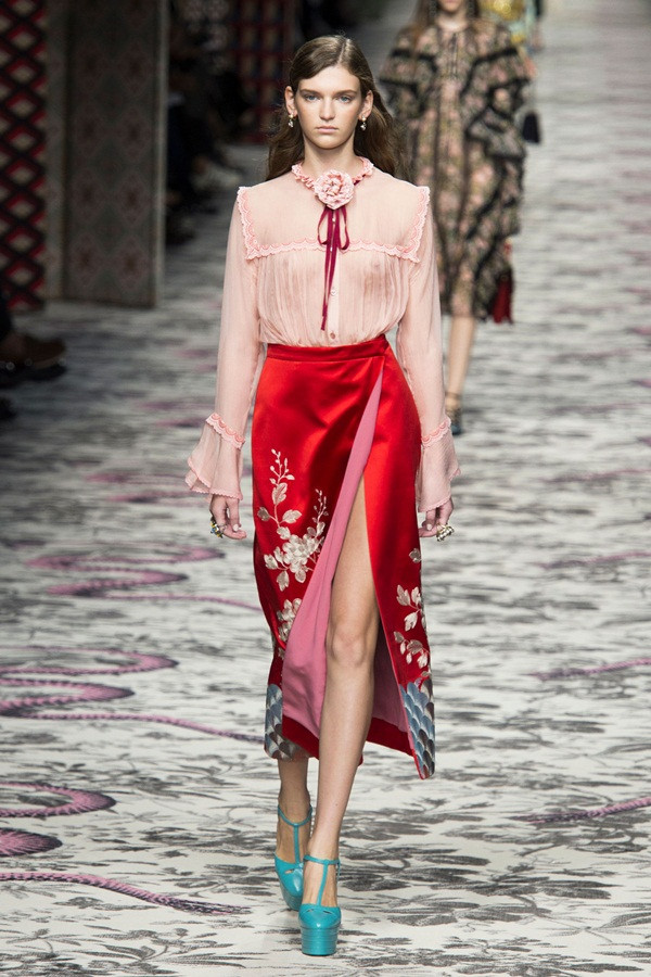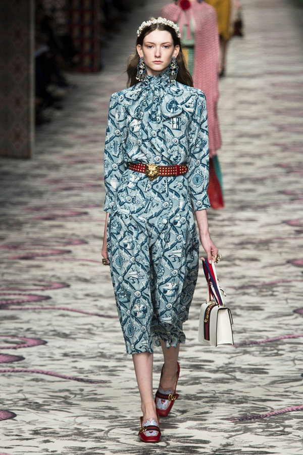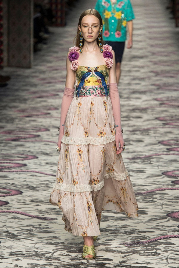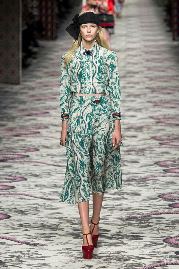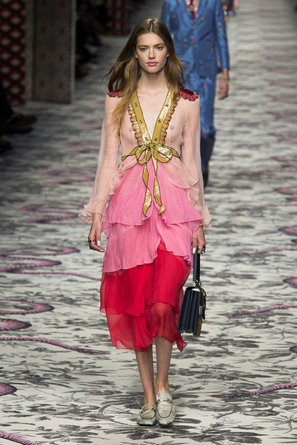 Phong cách chủ đạo trong BST xuân hè 2016 của Gucci là những chiếc váy xòe nhẹ, có xếp li với độ dài chờm gối, chất liệu lụa mềm mang đậm cảm hứng bohemian dịu dàng.