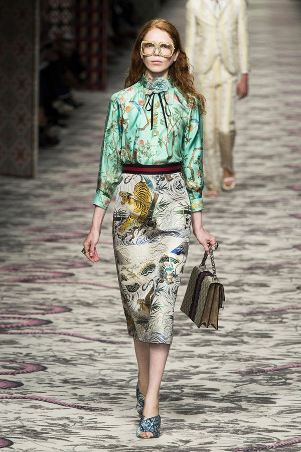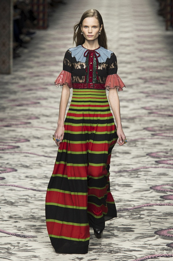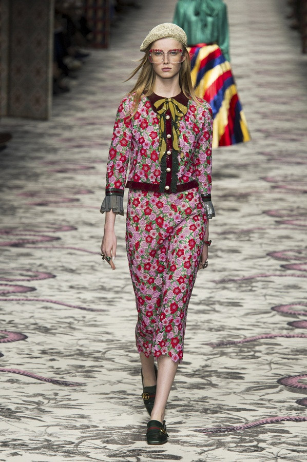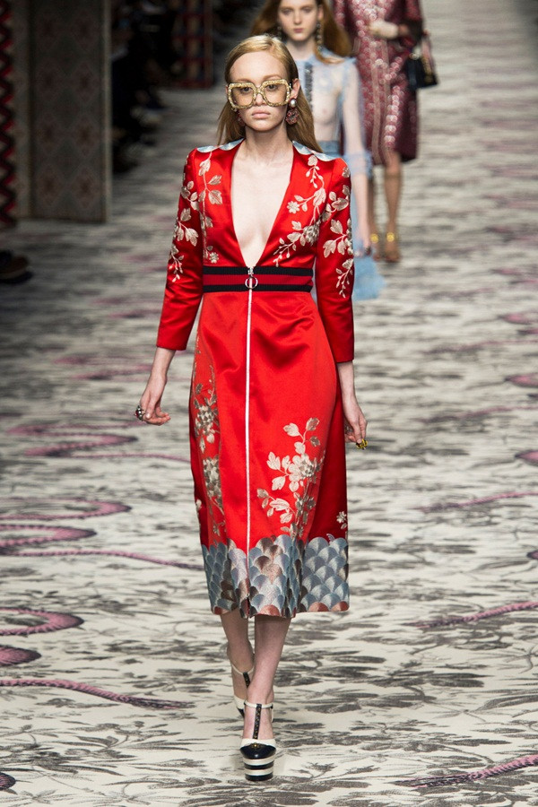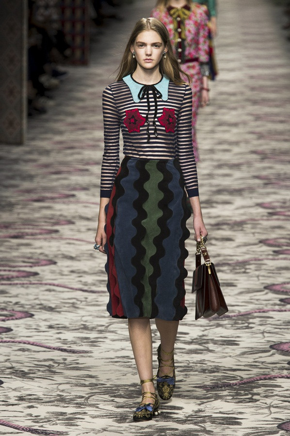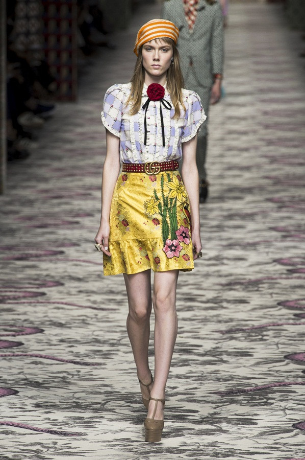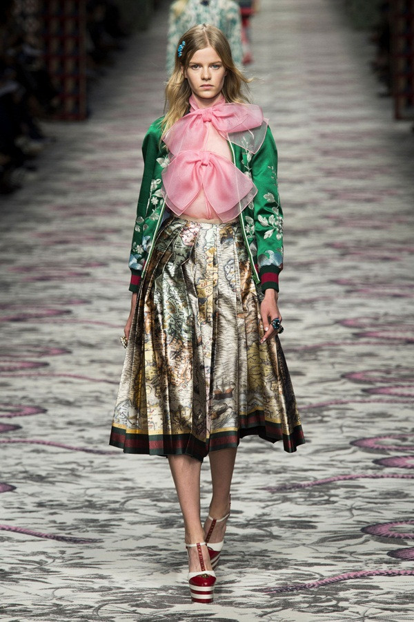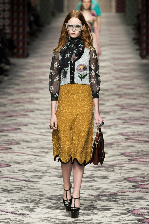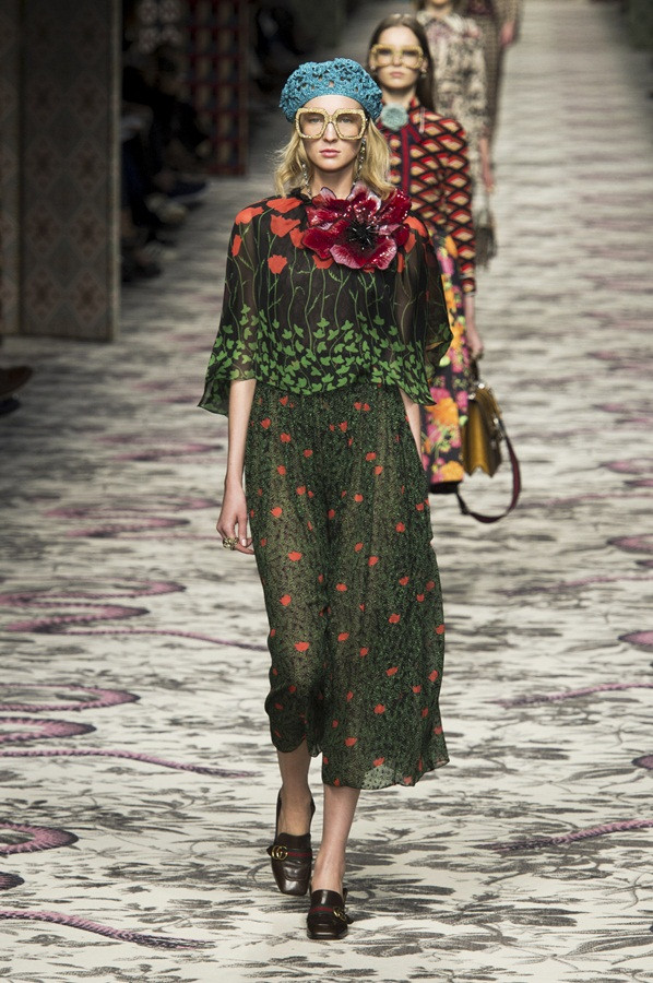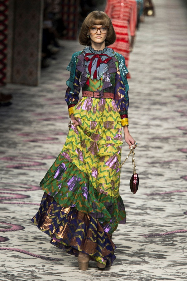 Phong cách chủ đạo trong BST xuân hè 2016 của Gucci là những chiếc váy xòe nhẹ, có xếp li với độ dài chờm gối, chất liệu lụa mềm mang đậm cảm hứng bohemian dịu dàng.