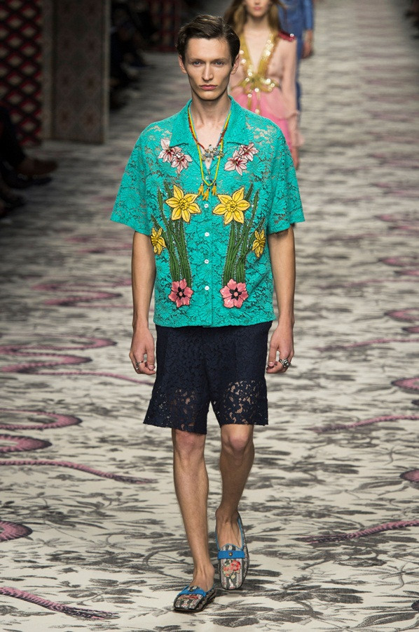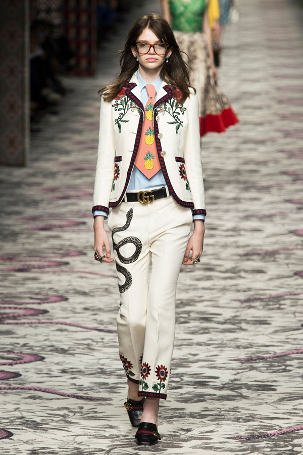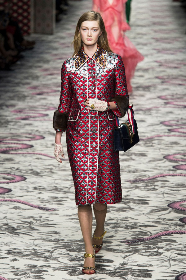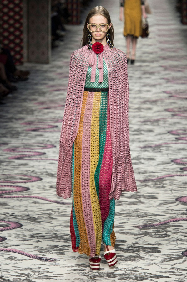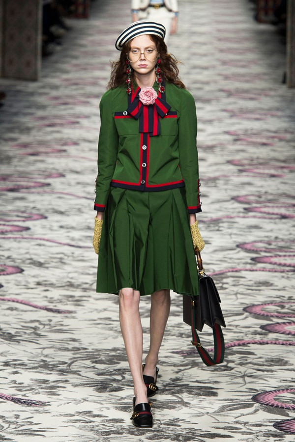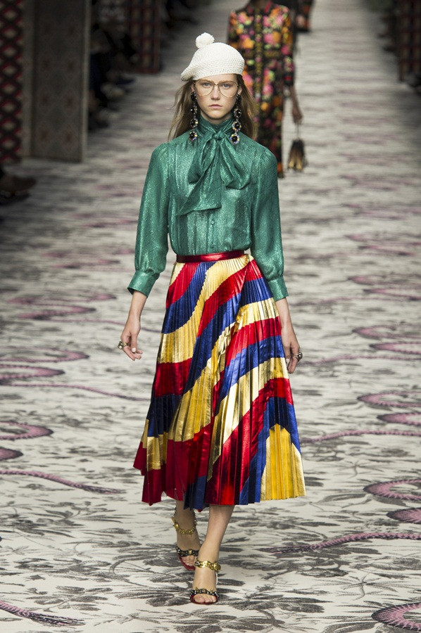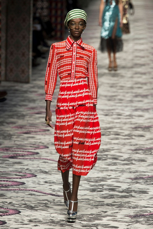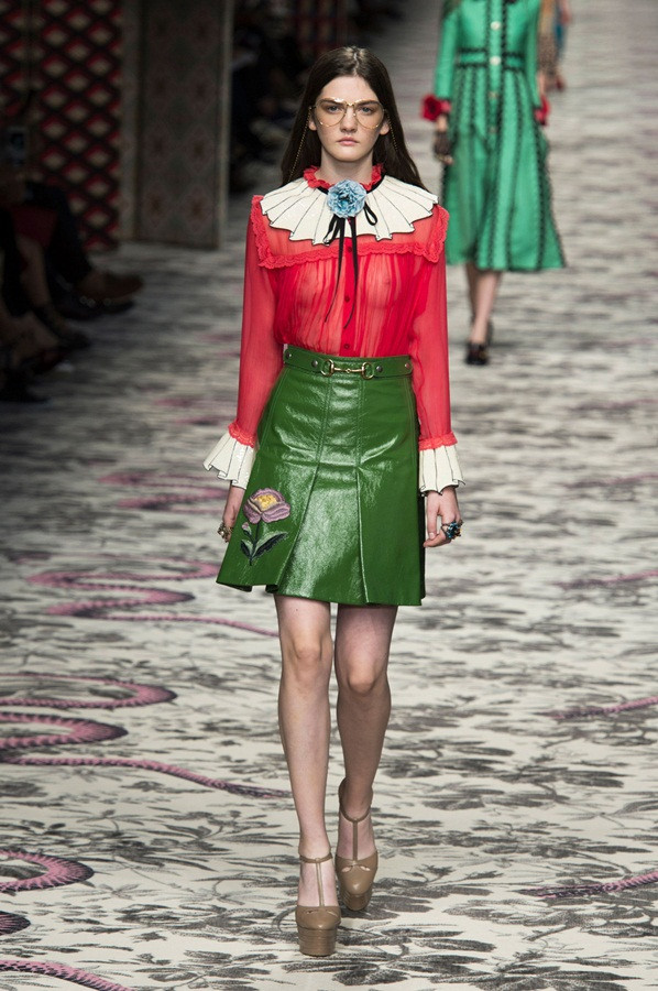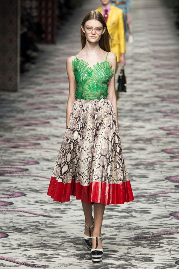 Phong cách chủ đạo trong BST xuân hè 2016 của Gucci là những chiếc váy xòe nhẹ, có xếp li với độ dài chờm gối, chất liệu lụa mềm mang đậm cảm hứng bohemian dịu dàng.