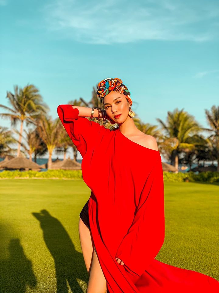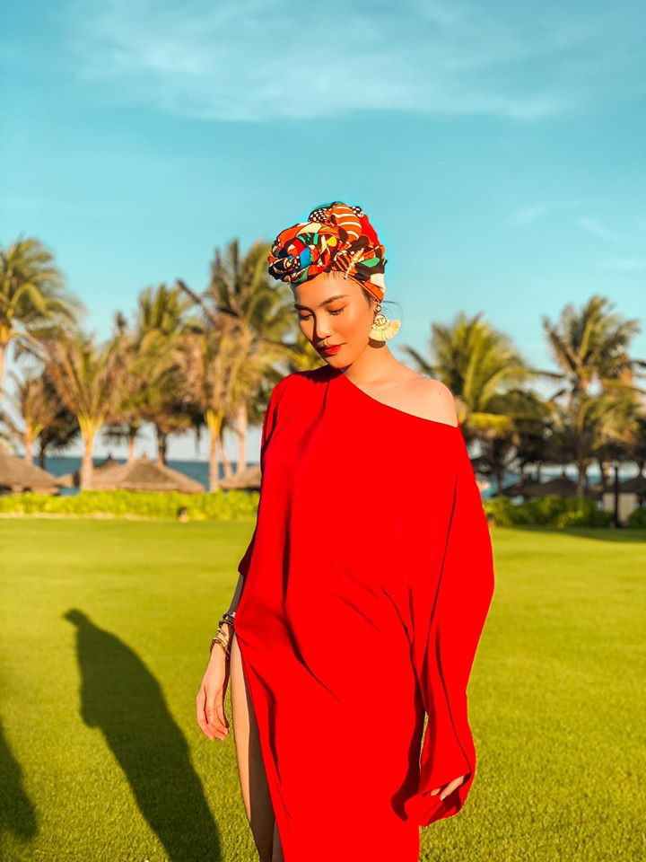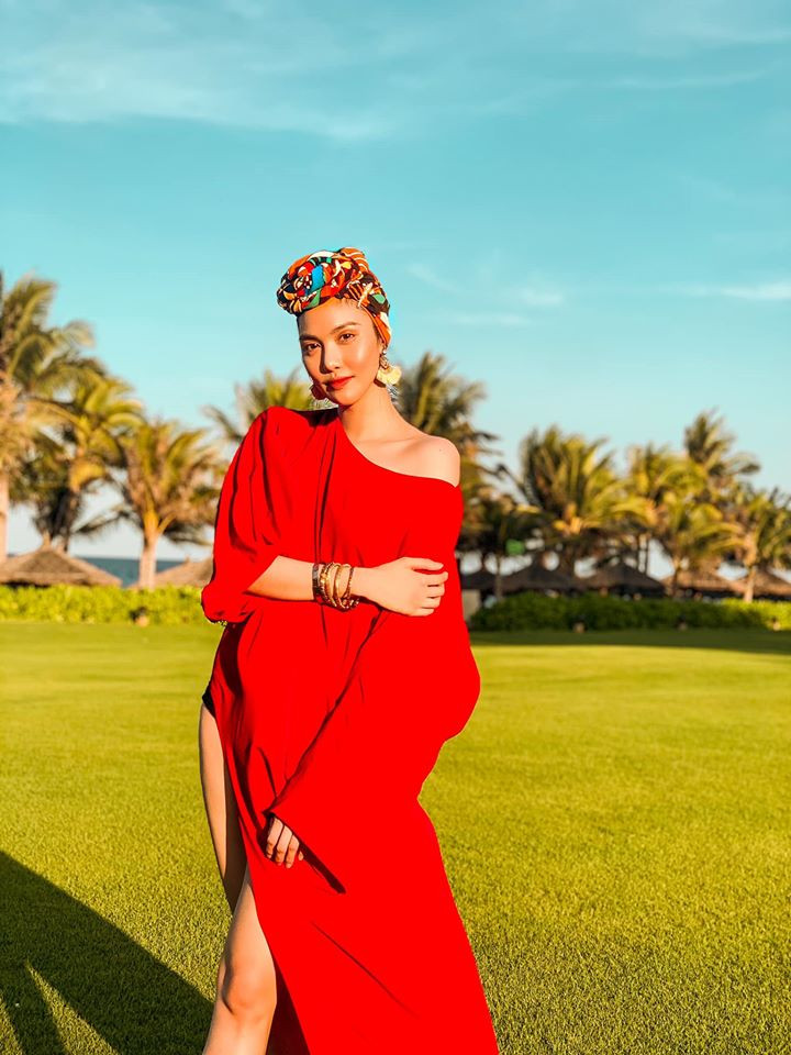 'Gái một con' lên đồ như đi diễn với bộ trang phục đi biển màu đỏ kiểu dáng oversize cực kỳ sành điệu.