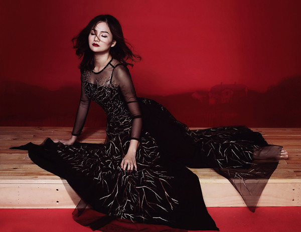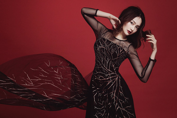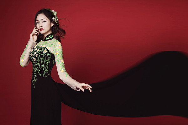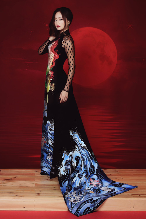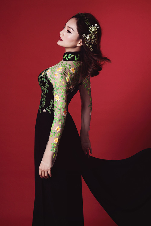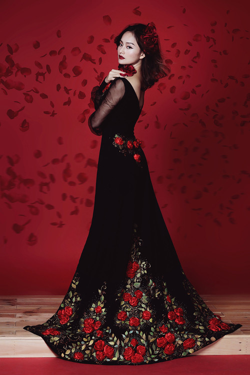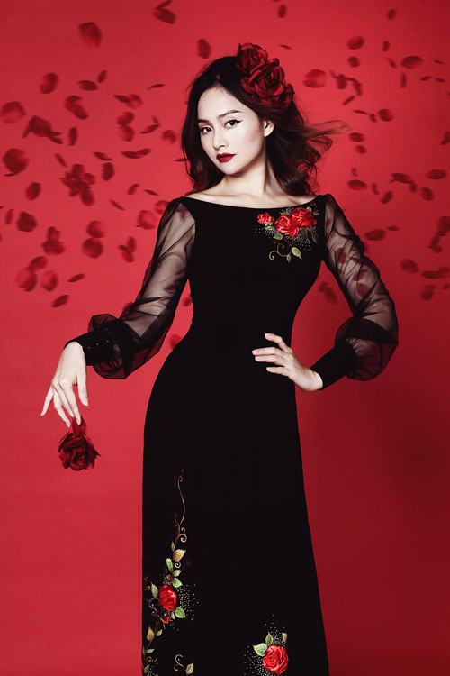 Nữ diễn viên kiêu sa và quyến rũ trong một thiết kế áo dài khoét lưng táo bạo cùng họa tiết hoa hồng 3D thêu nổi bằng ruy băng.