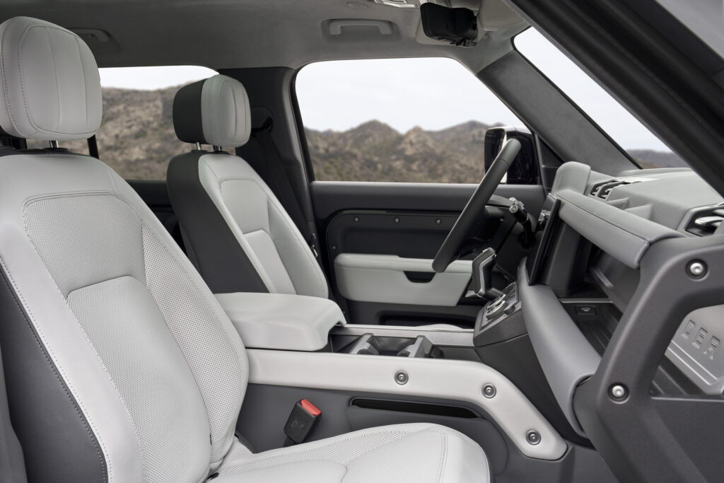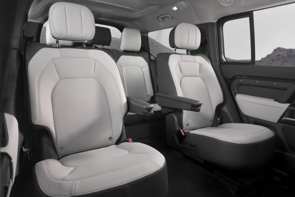 Hàng ghế trước chỉnh điện 14 hướng có chức năng nhớ vị trí, trong khi hàng ghế thứ ba ở Defender 130 có chức năng sưởi. Ngoài ra, bản Defender 130 còn có thêm tùy chọn ghế cơ trưởng ở hàng ghế thứ hai.