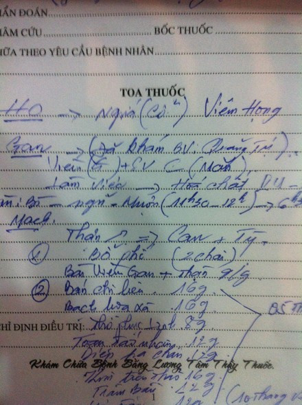 Mặc dù khám bệnh qua loa nhưng trong phiếu thanh toán ghi rõ “phí khám và mua sổ hết 60 ngàn đồng”. Khá kì lạ nữa, tất cả bệnh nhân đều được thầy khám y hệt nhau, bốc bài thuốc na ná nhau.
