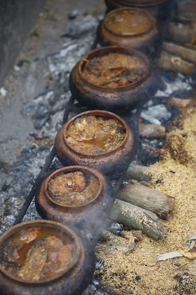 Niêu cá kho một lửa suốt thời gian dài nên luôn phải có người canh bếp. Lửa không được để lớn ngọn và lúc nào than cũng đỏ.