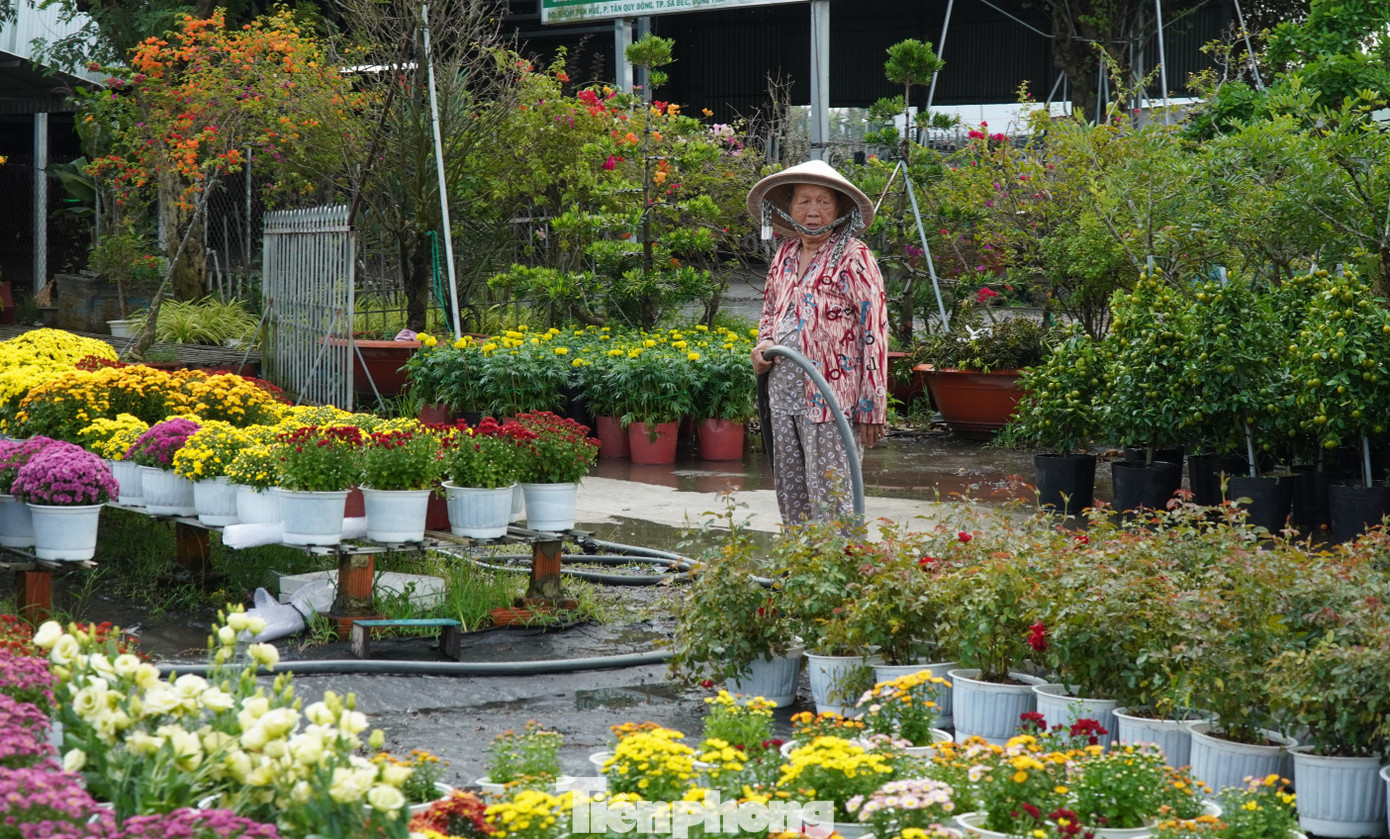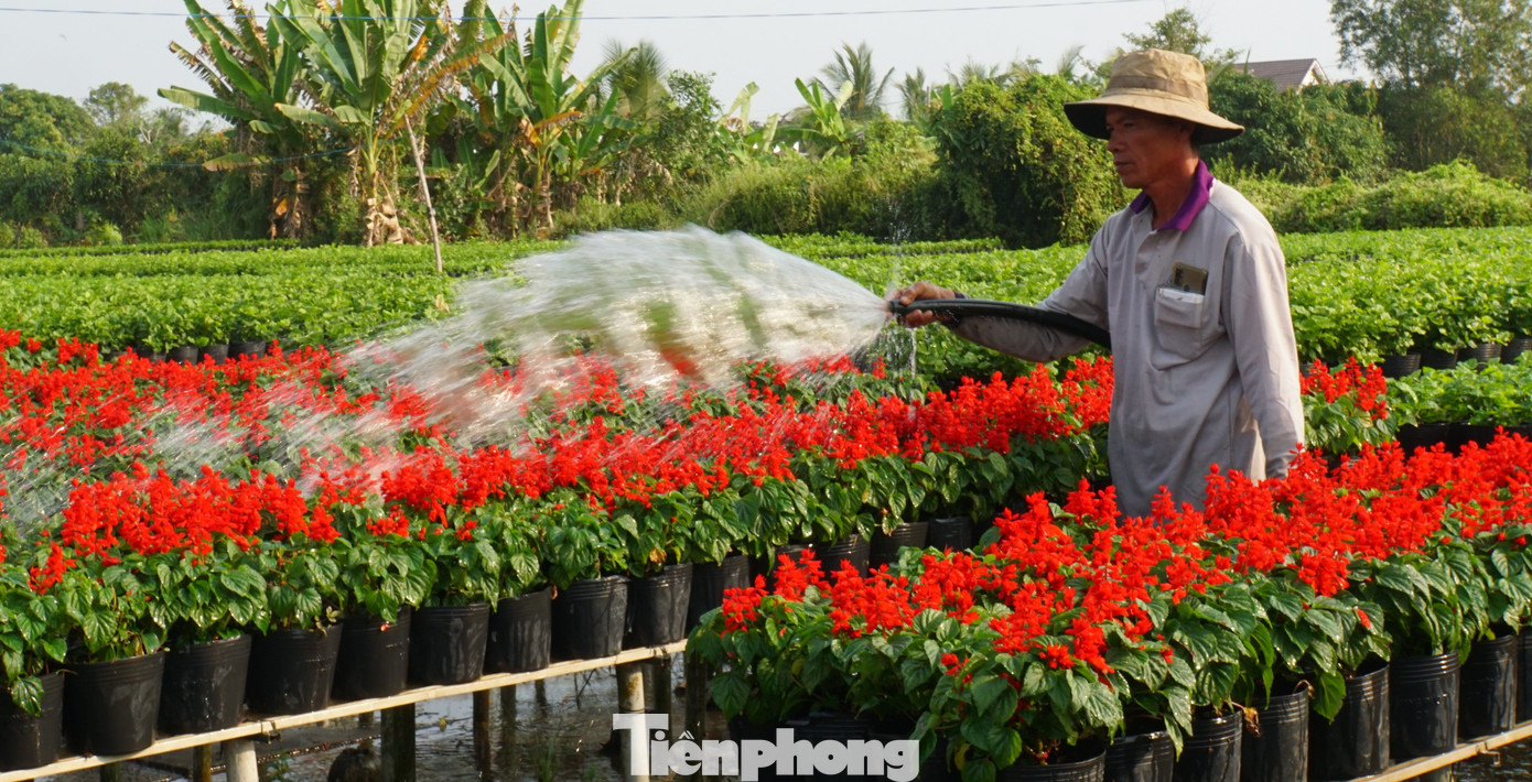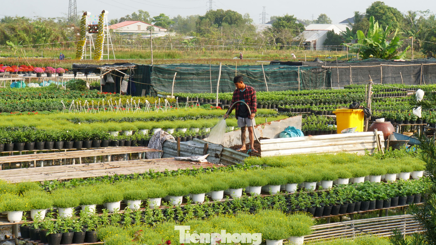 Điểm đặc biệt của làng hoa Sa Đéc là các hộ trồng trên mặt nước. Để chăm sóc hoa, chủ vườn lội nước để tưới. Ảnh: Hòa Hội