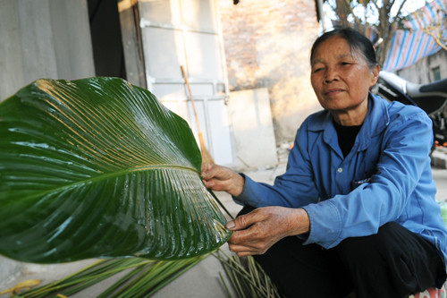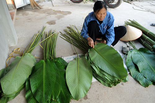 Bên con đường chính giữa làng, bà Nguyễn Thị Tuyên, 70 tuổi, đang xếp lá dong thành từng bó một trăm lá. Vụ Tết này, nhà bà được mùa lá dong, thu hoạch được 6 mớ (6 vạn tàu).