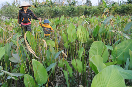 Trên cánh đồng đầu làng, chị Hà Thị Tú, 24 tuổi, dắt con trai đi qua những đám dong vừa qua vụ thu hoạch. Ở Tràng Cát, trồng lá dong là nghề chính, gần như nhà nào cũng có ruộng trồng.